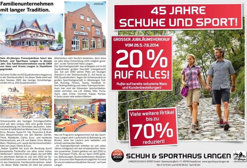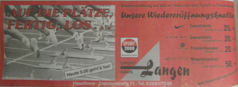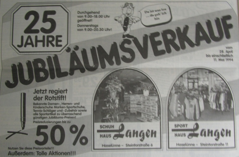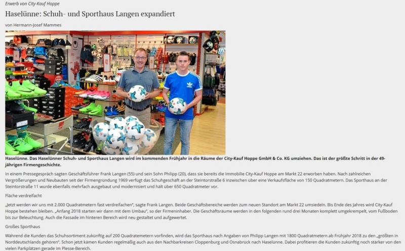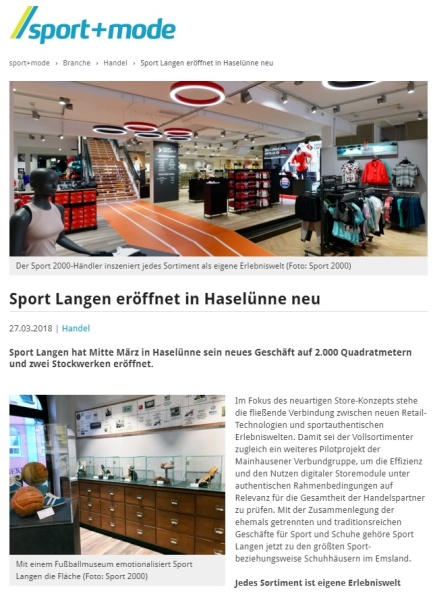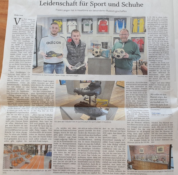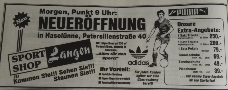 Bereits Anfang der 70er-Jahre kamen erste Sportartikel mit in das Geschäft dazu. Da Firmengründer Johann Langen selbst aktiver Sportler, langjähriger Fußballspieler- und Trainer, war, bestand von Beginn an eine Leidenschaft für Sportartikel. Die Fußballschuhe der Traditionsmarken Adidas und Puma wurden zu dieser Zeit noch von ehemaligen Nationalspielern wie Uwe Seeler, Max Lorenz oder Pico Schütz als Vertreter verkauft. Somit waren regelmäßige Besuche in der Korn- und Hansestadt Haselünne eine Selbstverständlichkeit.