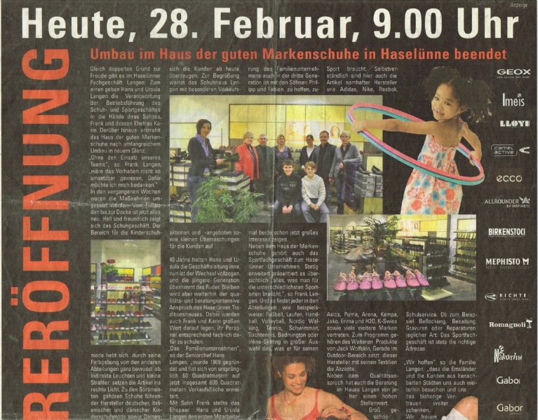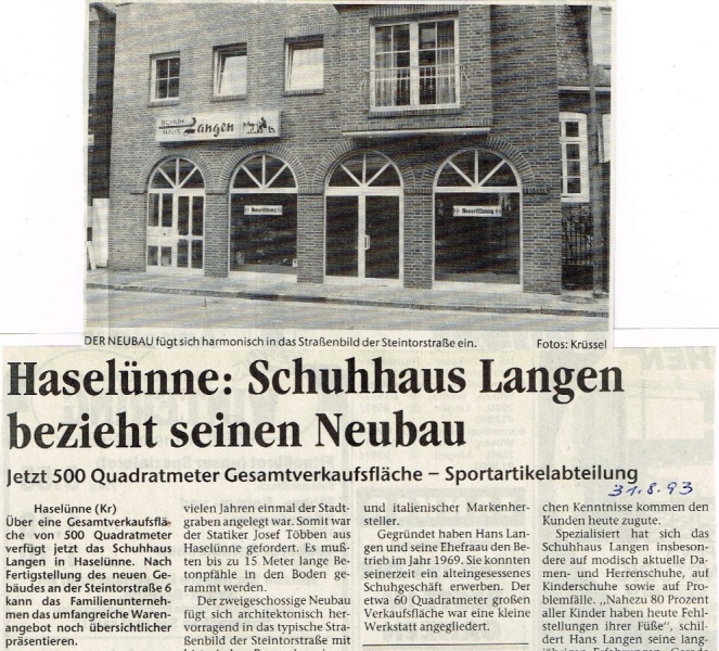 Nach einer komplizierten Bauphase, aufgrund der engen Stadtbebauung, konnte die Neueröffnung des Schuhhauses am 01. September 1993 gefeiert werden. Das neue Stadthaus passte sich gut in das historische Stadtbild Haselünnes ein. Auf ca. 160 m² wurden von nun an Schuhe in einem modernen Ambiente präsentiert.